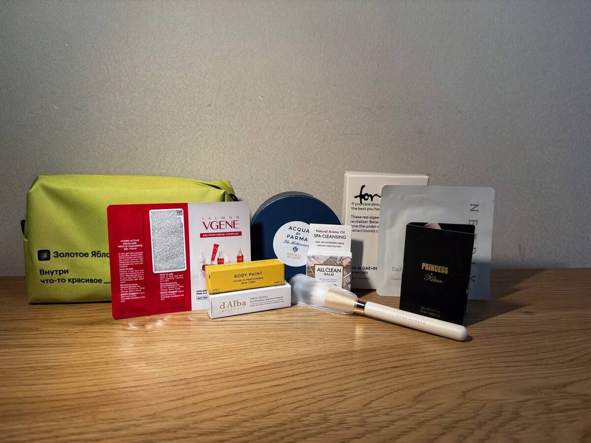 во время формирования последнего крупного заказа обнаружила что накопила 1600 бьютисов, которых как раз хватает на косметичку с наполнением-сюрпризом. Я, конечно, хотела бьюти бокс за 2000, но поклонников приложения и бьюти новинок такое количество в нашей стране, что словить момент практически нереально))) Итак, что я получила бонусом за оставленные в магазине деньги : • сама косметичка : больше классических ЗЯ и из менее маркого материала, лайк! • пробник парфюма Princess от Kilian : понравился!! манящий, терпкий, на холодное время года супер; • кисть Dear Dahlia : ворс мягкий и тактильно приятный, будем тестировать в деле👌визуально красиваяяяя; • бальзам для губ Dalba : питательный, в меру жирнит, лишним не будет точно) необходимо всем и всегда; • отшелушивающие диски NEEDLY : мини упаковка из двух штук; • пробник парфюма Body Paint : захотелось полноценный, ооочень подошел. легкий, сладко-свежий; • очищающий бальзам для лица heimish : мини версия; • патчи тонизирующие fo