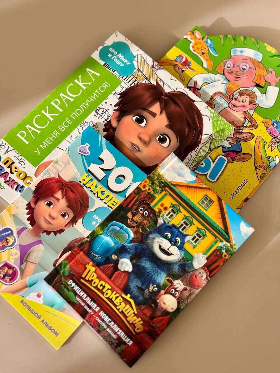 🟢Простоквашино. Официальная новеллизация Юлианна Перова Дядя Фёдор никакой не "дядя", а мальчик, просто очень самостоятельный и серьёзный. Но его родители и слышать ничего не хотят о том, чтобы в их квартире завёлся кто-то хвостатый или лохматый. И приходится Дяде Фёдору со своим новым приятелем — котом Матроскиным — отправиться жить в деревню Простоквашино. А там они знакомятся с псом Шариком, неугомонным галчонком Хватайкой и вредным почтальоном Печкиным. 🟢Раскраска с Мирой и Гошей. У меня всё получится! Просто о важном — популярный мультфильм о взаимоотношениях в семье и с окружающим миром: - крупные иллюстрации специально для маленьких художников - вопросы, на которые можно отвечать всей семьёй; - вдохновляющие страницы — придумай историю о Мире, Гоше и Бейби. 🟢Мира и Гоша. 200 наклеек: большой альбом Мира, Гоша и их маленькая сестрёнка Бейби каждый день сталкиваются с чем-то совершенно новым! Но что бы с ними ни произошло, взрослые вокруг всегда поддержат и помогут! В альбом