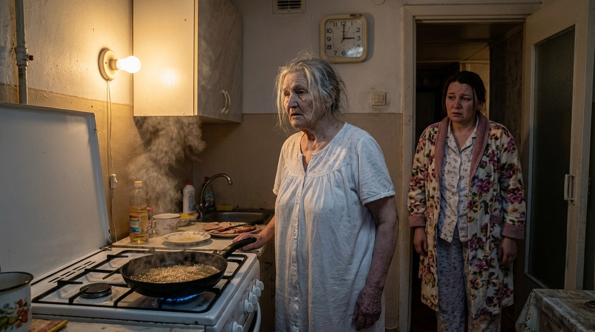 Варвара Петровна стояла у плиты в ночной рубашке. На сковороде шкворчало масло.