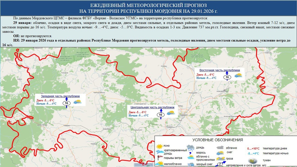 ❄️ 29 января в Мордовии облачно, осадки в виде снега, мокрого снега и дождя, днем местами сильные, в отдельных районах метель, гололедные