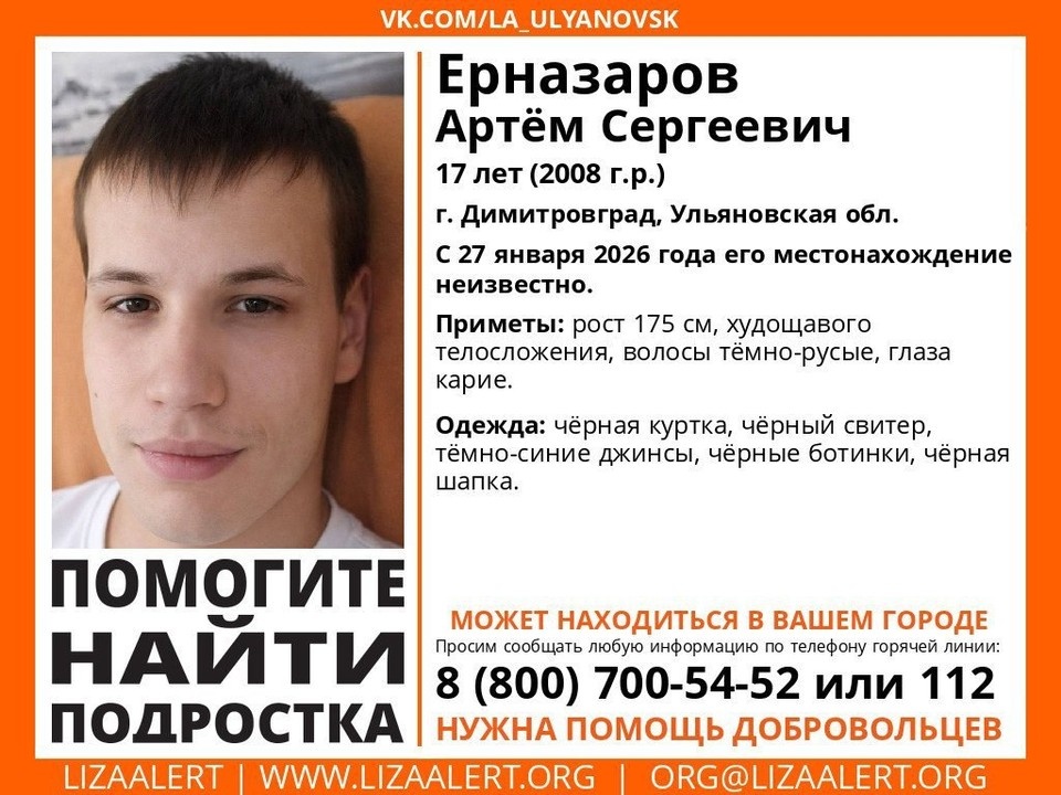 В Ульяновской области объявлен в розыск 17 летний житель Димитровграда Ерназаров Артём Сергеевич, 2008 года рождения. По имеющимся данным, он пропал 27 января 2026 года. С тех пор о его местонахождении ничего не известно. Артёму 17 лет, рост около 175 сантиметров, худощавого телосложения. Волосы тёмно-русые, глаза карие. В день пропажи он был одет в чёрную куртку, чёрный свитер, тёмно-синие джинсы, чёрные ботинки и чёрную шапку. Если вам что-либо известно о местонахождении Артёма Ерназарова, просьба позвонить инфоргу Юлии (позывной «Верба») поискового отряда ЛизаАлерт по телефону: 8 960 360 60 74.