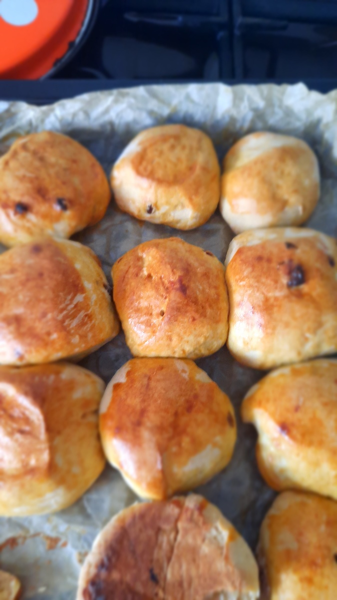 Андрей с работы ехал и купил мне дрожжи, чтоб не расстраивалась. Так мы после обеда вторую партию булочек с малявочкой замесили. Без изюма, чтоб и Оля ела. Вот это тесто! Пух! Разошлись булочки по всему противню в духовке — красота! А запах выпечки в доме — не передать!