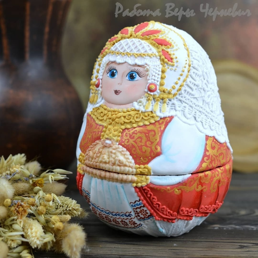 Эта объёмная пряничная матрёшка - настоящая визитная карточка мастера, который работает в премиум-сегменте. Каждая деталь здесь проработана с ювелирной точностью: от идеальных выкроек и расчёта размеров до филигранной росписи в нескольких техниках.