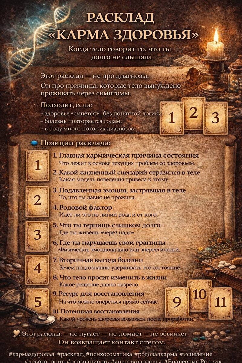 » Когда тело говорит то, что ты долго не слышала Этот расклад — не про диагнозы. Он про причины, которые тело вынуждено проживать через симптомы. Подходит, если: — здоровье «сыпется» без понятной логики — болезнь повторяется годами — лечение есть, а облегчения нет — в роду много похожих диагнозов 🔹 Позиции расклада: 1️⃣. Главная кармическая причина состояния Что лежит в основе текущих проблем со здоровьем. 2️⃣. Какой жизненный сценарий отразился в теле Какая модель поведения привела к этому. 3️⃣. Подавленная эмоция, застрявшая в теле То, что ты давно не прожила. 4️⃣. Родовой фактор Идёт ли это по линии рода и от кого. 5️⃣. Что ты терпишь слишком долго Где ты живёшь «через надо». 6️⃣. Где ты нарушаешь свои границы Физически, эмоционально или энергетически. 7️⃣. Вторичная выгода болезни Зачем подсознанию удерживать это состояние. 8️⃣. Что тело просит изменить в жизни Какое решение давно назрело. 9️⃣. Ресурс для восстановления На что можно опереться прямо сейчас. 1️⃣0️⃣. Что