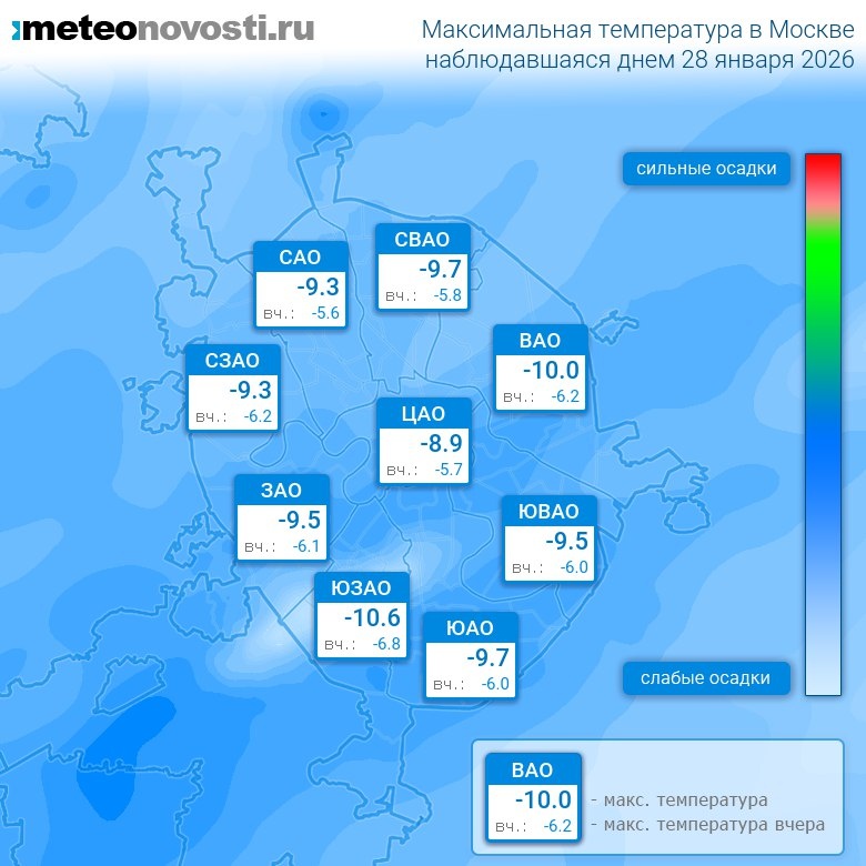 Максимальная температура днём в Москве была на 5.2°C ниже нормы, что немного холоднее, чем обычно. Самая высокая температура -8.9°C была зафиксирована в 10 часов в центре города, а холоднее всего было на юго-западе: -11.7°C. Разница по максимальной температуре в разных частях столицы составила за день 2.8°C. Максимальные порывы ветра днём достигали 4 м/с. Атмосферное давление за день не изменилось и составило 743 мм.рт.ст. Повсеместно прошли осадки. Больше всего осадков выпало на юге города – 7.5 мм. Самый теплый день в Москве 28 января был в 2025 году, когда максимальная температура составила +5.3°C, а холодный в 1956 году: -23.2°C. Перейти на сайт Прогноз погоды на 14 дней
