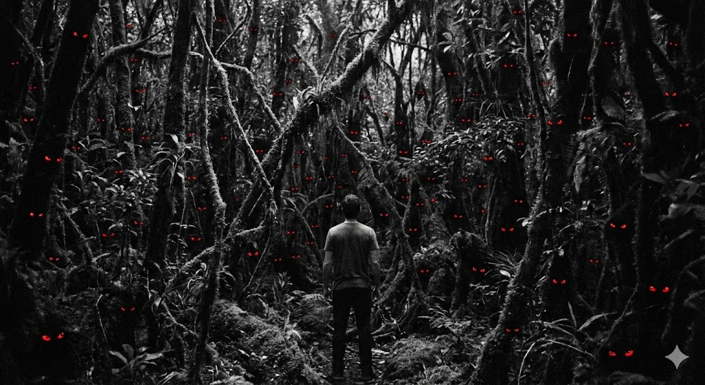 Я пытался сориентироваться, когда понял, что больше не слышу группу. Вообще ничего не слышу. Звуки живых джунглей смолкли. Полная тишина. И тут я услышал, как вокруг меня хрустят ветки. Шорох листьев. А потом — смех. Детский смех. Тихое хихиканье, эхом разлетающееся среди деревьев.