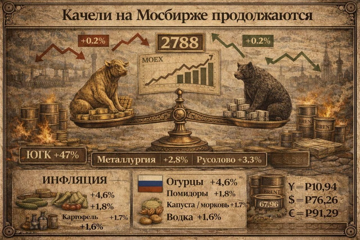 Качели на московской бирже снова продолжаются тем не менее индекс московской биржи сегодня прибавил 0,2% достигли 2788 пунктов по индексу, но данные высоты мы видели в декабре, сентябре и т.д. 2025 года. Несмотря на боковик, есть бумаги, которые показывают рост – это бумаги золотодобытчиков, особенно бумаги ЮГК, которые за январь прибавили 47%. Сегодня также растет черная и цветная металлургия, хочется отметить бумаги ММК плюс2,75%, Мечел 3,74%, Русолово плюс 3,31%. Не железо, но растет – деревянный Серёжа прибавляет 3,02% Позитив поверил в себя и стал позитивным, бумаги прибавили 3,68%. Уверенности рынку придают цены на черное золото нефть марки Brent 67,96 за бочку, цены растут, наверное, на зло Трампу. Вышли данные по инфляции: инфляция в РФ с 20 по 26 января 2026 года составила 0,19% после 0,45% с 13 по 19 января и 1,26% с 1 по 12 января. Годовая инфляция в РФ на 26 января замедлилась до 6,43% с 6,46% на 19 января. Огурцы опять растут: pа период с 20 по 26 января 2026 года рост