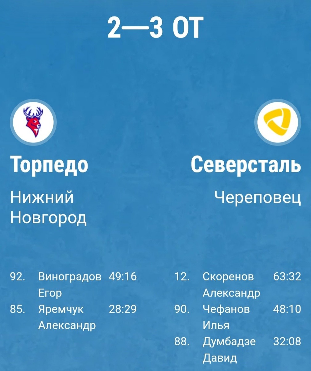 Череповчане пропустили первыми, но смогли сравнять счет и выиграть в овертайме. Автором победной шайбы стал Александр Скоренов.