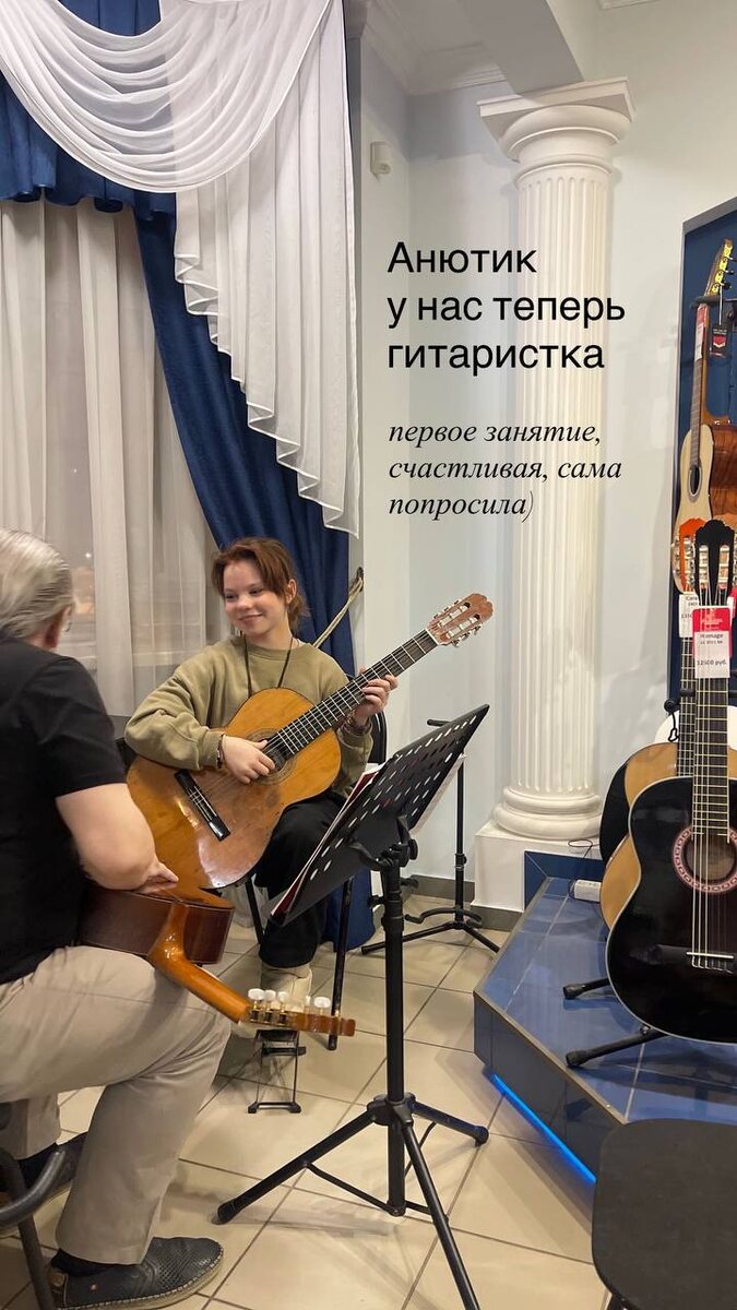 Сама решила, попросила найти школу и мы сразу попали к потрясающему учителю. Юрий Иванович музыкант и педагог с 40 летним стажем и при этом с ним детям очень легко и комфортно. Играет невероятно, объясняет так же. Мы второй раз видимся и в абсолютном восторге. Радуюсь что у Анюты это осознанный выбор и она к гитаре относится с такой ответственностью. Буду рассказывать как идут дела и если разрешит, сниму её успехи☺️ А ещё ведь недавно совсем была вот таким пупсом, как на втором фото)❤️