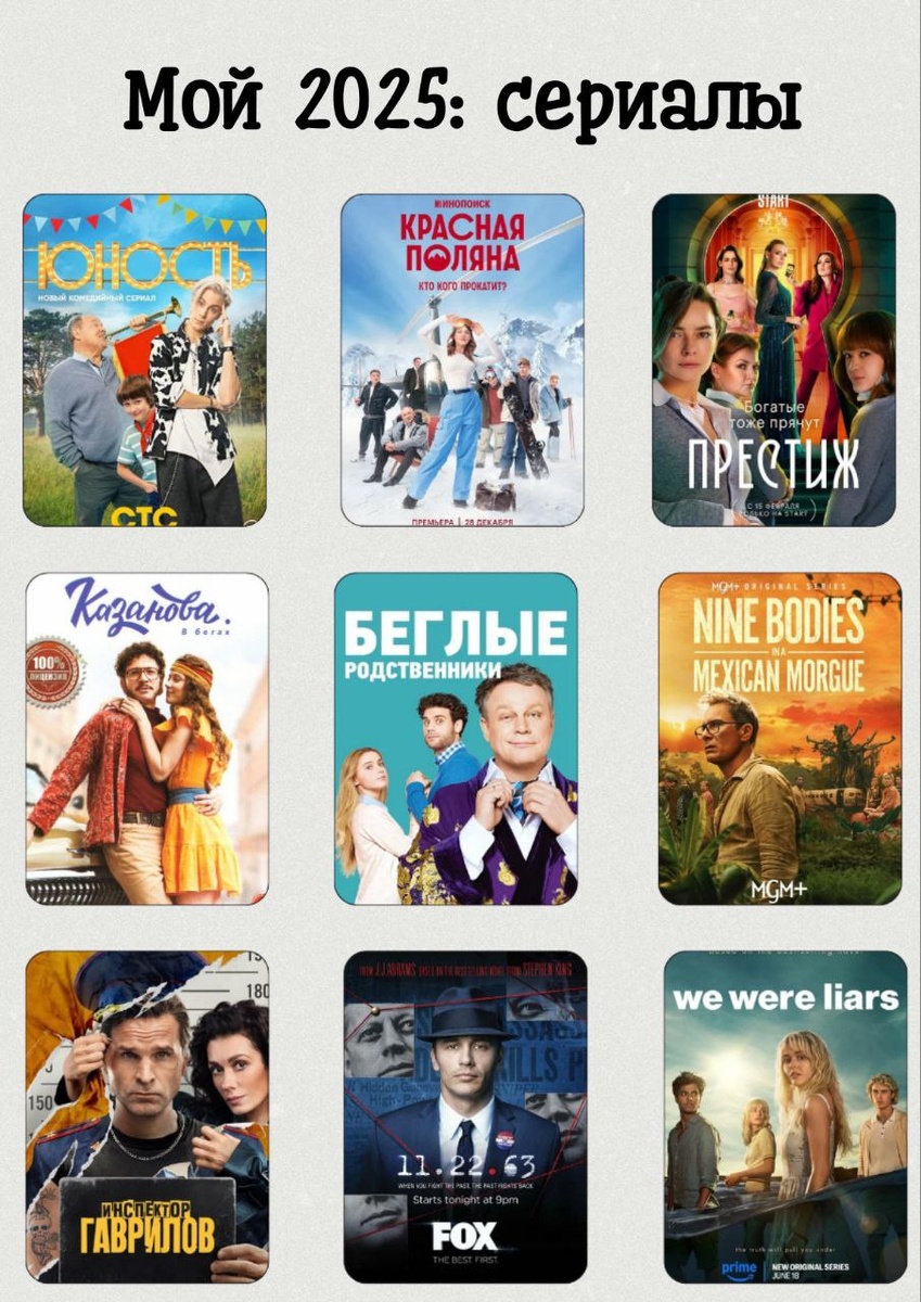 Наконец-то нашла время, чтобы сделать пост по моим сериальным итогам года! За 2025-й я посмотрела 45 сериалов, и среди них было много хороших. Как-то в последнее время русские сериалы мне нравятся больше англоязычных, за весь прошлый год я, наверное, всего парочку новых посмотрела, и они вошли в этот топ. Все российские сериалы можно посмотреть на Кинопоиске. ▪️ Юность - жизнерадостный летний сериал про накосячившего блогера, который вынужден отработать смену в детском летнем лагере. ▪️ Красная Поляна - динамичный сериал про аферистов, действующих на нашем знаменитом горнолыжном курорте. ▪️ Престиж - интересный детектив в стиле фильма "Ищите женщину" с расследованием убийства няни в элитном посёлке. ▪️ Казанова - авантюрный детектив про обаятельного шарлатана с атмосферой СССР 1970х. ▪️ Беглые родственники - смешной, но не пошлый сериал про беглого олигарха, который вынужден скрываться в квартире своего сына, пока тот пытается строить личную жизнь. ▪️ Nine Bodies in a Mexican Mo