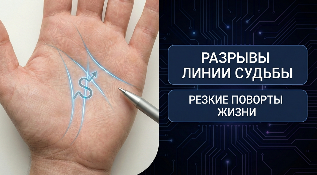 отчетливый разрыв на линии судьбы со смещением в сторону холма Юпитера.