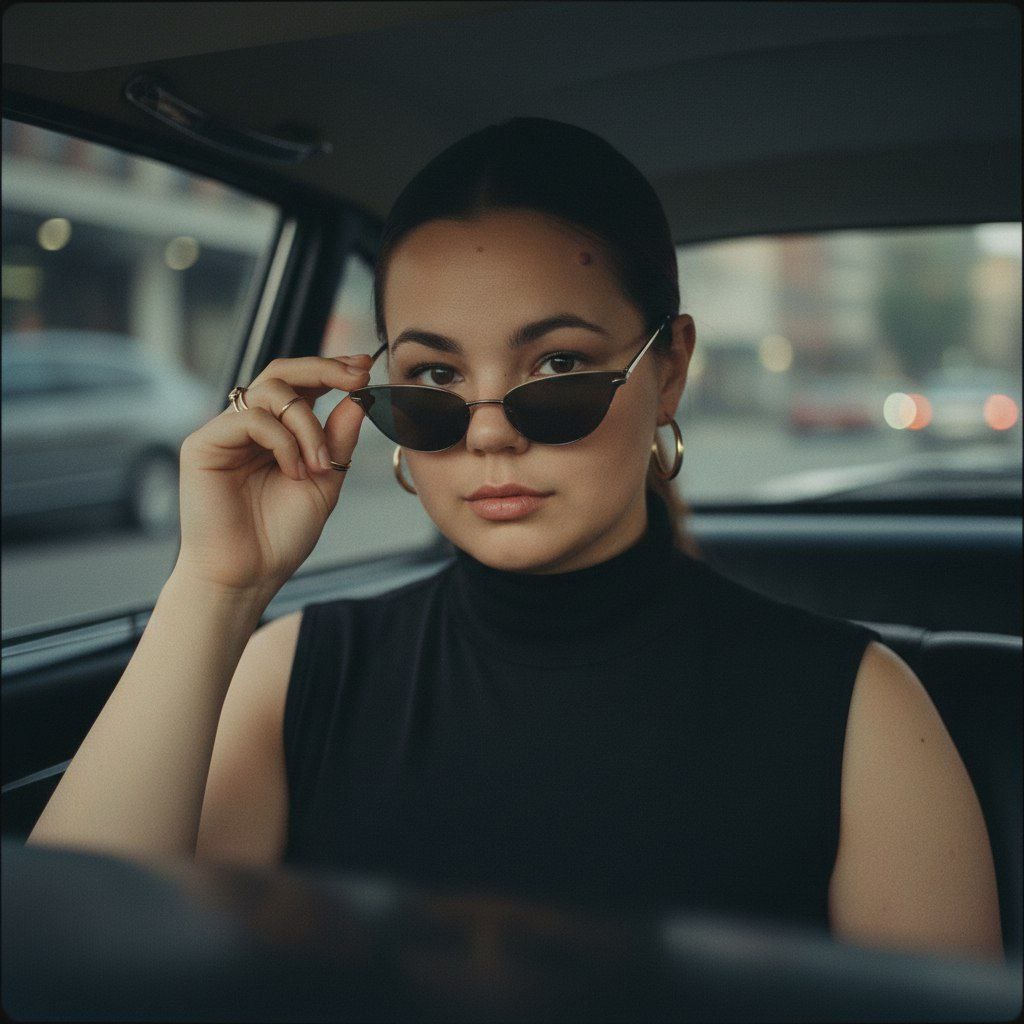 😀Выбираем "нейросети" 😀Нажимаем "Nano Banana" 😀Нажимаем "Nano Banana Pro" 😀Прикрепляем через скрепку свое фото и выбранный промпт 😀Наслаждаемся результатом😍 Use the user's appearance 1:1 — face, skin, hair, and body without any changes. Close-up portrait from passenger seat POV looking at driver, woman wearing a sleek black sleeveless turtleneck top, adjusting slim dark cat-eye sunglasses with a confident direct gaze, eyes visible over the frames. Her hair is sleekly pulled back. Features gold rings and gold hoop earrings. Inside a car, blurred dashboard reflection in foreground, with a soft, diffused, indirect light creating a mysterious and chic cinematic atmosphere. Moody aesthetic with subtle film grain, slight haze effect, desaturated color palette, low contrast, and shallow depth of field. Vintage 35mm film photography style.