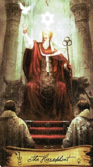 Он восседает на троне между двумя колоннами храма (уже не тайными, как у Жрицы, а явными, символизирующими мистическое и экзотерическое знание). У его ног — два коленопреклонённых ученика (монаха, послушника), один в одежде с лилиями (чистота, посвящение), другой — с розами (страсть, преображенная верой). В одной руке он держит тройной крест (власть над тремя мирами: физическим, душевным, духовным), другой — совершает жест благословения. Его взгляд не властен, как у Императора, но полон непоколебимой убеждённости и наставнической строгости. Он не строит империи и не рождает новое — он хранит, толкует и передаёт. Он — живой мост между человеческим и божественным, устами, через которые говорит сама Традиция.