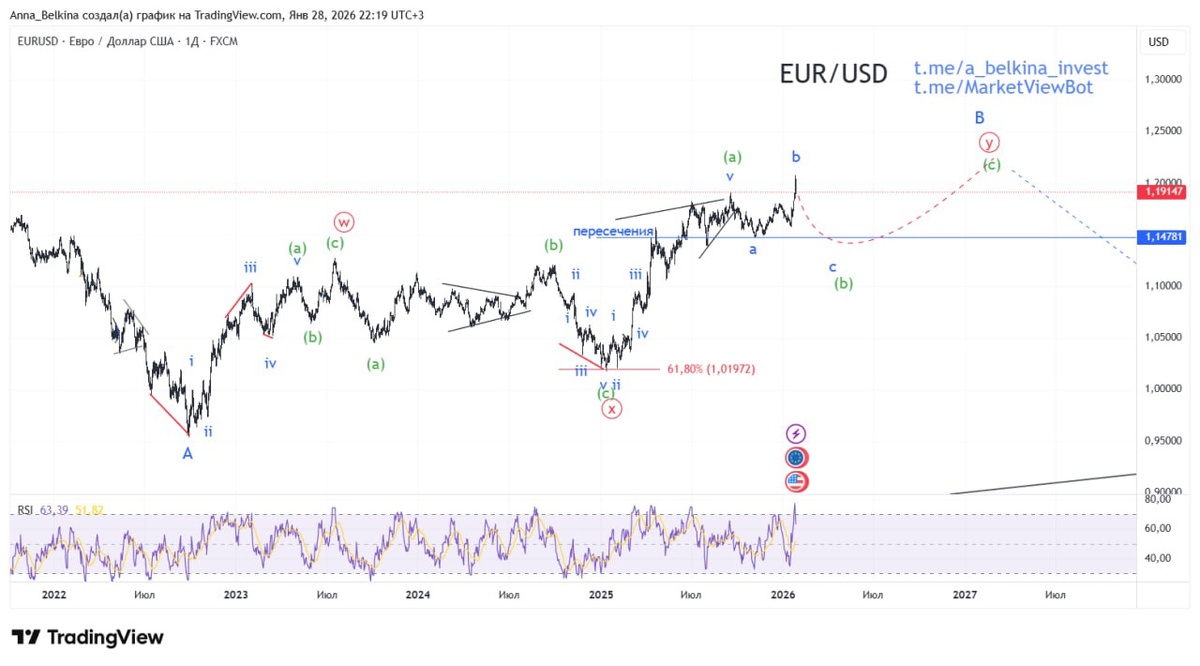 Евро также находится под давлением своих проблем. С одной стороны, единую валюту сдерживают слабый экономический рост в Еврозоне, разногласия внутри ЕС и осторожная позиция регуляторов. С другой стороны, намеренное ослабление доллара со стороны Вашингтона укрепляет позиции евро по отношению к доллару. Так, если укрепление евро продолжится, то это может повлиять на инфляцию и следовательно на денежно-кредитную политику ЕЦБ - потребуется очередное снижение ставки или словесные интервенции для сдерживания чрезмерного укрепления евро. Сильный евро бьет по экспортерам, особенно по промышленности Германии и юга ЕС. ЕС пытается избегать сильного евро для сохранения ценовой конкурентоспособность экспорта. По технике - здесь несколько иная картина. Пока я склоняюсь к тому, что волна (b) принимает вид бегущей плоскости. 💪 БОЛЬШЕ разметок в Закрытом канале: Бот Закрытого Канала, доступен Пробный Период! (подписаться из-за границы, пишите личным сообщением)