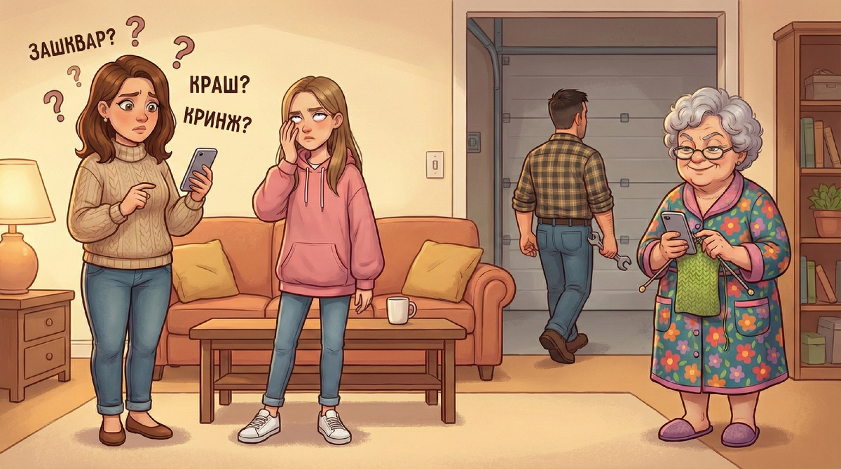 Моя дочь Маша написала мне в субботу: «Мам, скинь на карту, я в зашкваре полном, краш инвайтнул в кино». Я перечитала три раза. Потом ещё раз. Потом показала мужу. — Серёж, это русский язык? — Не моё дело, — философски отозвался Серёжа и ушёл в гараж. Ну да. Конечно. Когда надо разобраться в чём-то важном — сразу «не моё дело». Когда надо решить, какой телевизор купить — три часа в интернете. Но я отвлеклась. Так, сообщение. Разберём по частям, как археологи разбирают древние свитки. «Зашквар» — судя по интонации, что-то плохое. Гуглю. Так, позор, неловкая ситуация. Логично. Дочь в беде. «Краш» — авария? Она попала в аварию?! Меня аж в жар бросило. Нет, стоп. Она просит денег на кино. В аварии в кино не ходят. Гуглю дальше. Ага, «краш» — объект романтического увлечения. Мальчик, короче. Мальчик позвал мою дочь в кино. Так. «Инвайтнул» — пригласил? Наверное. Звучит как приглашение. Десять минут я потратила на расшифровку одного предложения. Десять минут. Я, между прочим, два языка знаю.