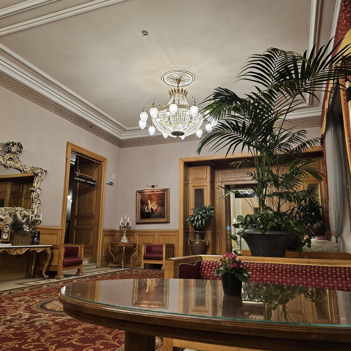 Так получилось, что им не удалось заселиться в выбранный отель и Яндекс Путешествия перебронировали похожую гостиницу. Ей оказалась Националь. Та самая, что на углу Тверской и я Охотного ряда с видом на Кремль. Мы побродили по коридорам отеля, пообщались с охранником на вид бандюган из 90х. Место неоднозначное — вроде и дорого-бохато, но ощущение, что ты в прошлом веке. Сами интерьеры гостиницы на это указывают, изрядно потрепанная отделка номеров, коцанная мебель, грязные стены, изношенные ковры. Это реальная машина времени в перестроечную Москву, где за внешним лоском и диким ценником скрывается отечественный пафосный недосервис. Теперь я точно знаю, что в этом отеле я не остановлюсь 😂 но было интересно полазить внутри. В этом посте есть большое видео, которое не загрузилось в Дзен. Откройте оригинал поста в телеграме, чтобы его посмотреть