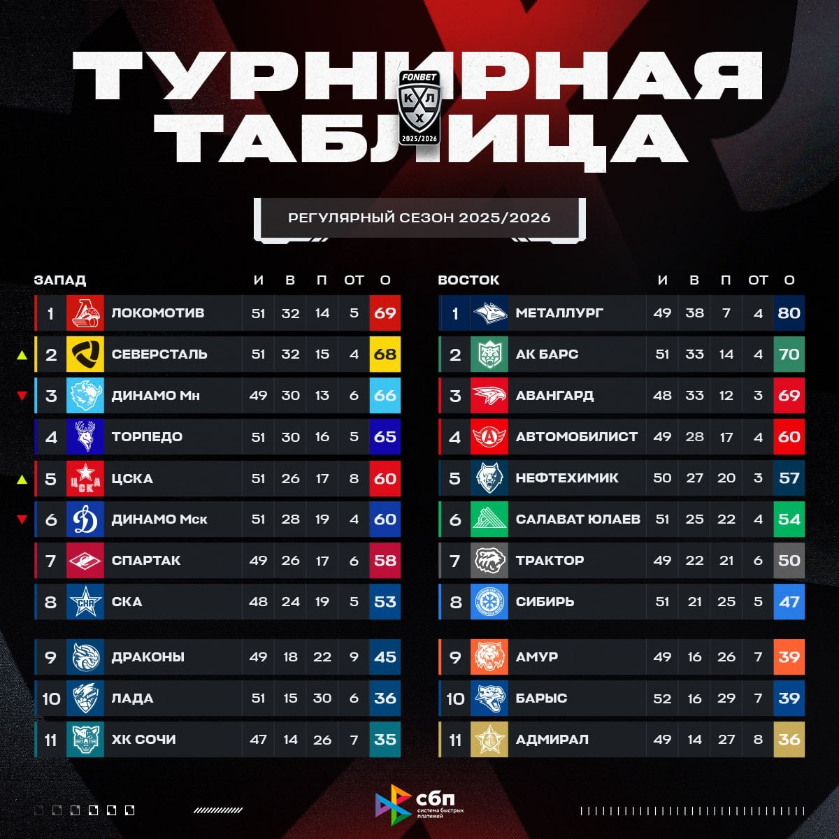 «Северсталь» поднялась на вторую строчку, ЦСКА — на пятую.