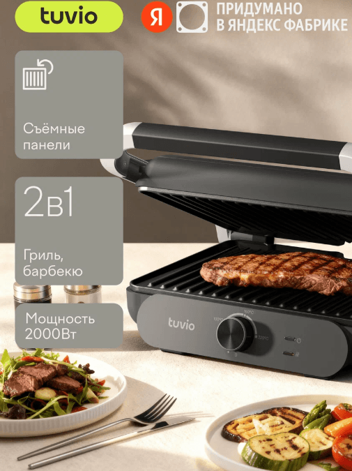 Гриль электрический со съемными панелями и таймером Tuvio TG05MP — это многофункциональный прибор от бренда Tuvio (производство Яндекс Фабрика), который сочетает функции гриля, барбекю, печи и даже вафельницы. Выпущенный в 2025 году, он ориентирован на повседневное использование в семьях, где ценят быстроту приготовления и удобство. Основные особенности: съемные панели для легкой замены и очистки, встроенный таймер для точного контроля времени, механическое управление и мощность 2000 Вт. Функционал позволяет готовить стейки, рыбу, овощи, вафли и другие блюда с минимальным использованием масла, с автоматическими режимами и регулировкой температуры до 220 °C. Также панели раскрываются на 180°, поэтому можно жарить продукты на обеих сторонах одновременно.