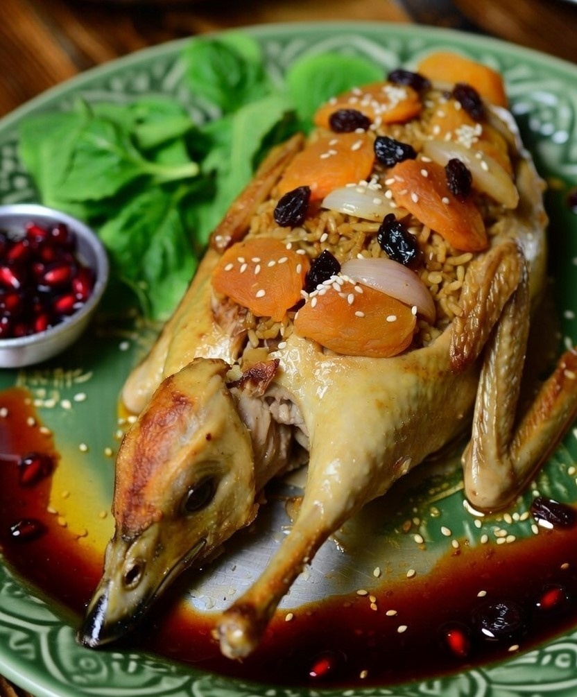 Ыштыкма — это не просто еда, это настоящее праздничное блюдо, которое готовили для важных гостей, свадеб и больших семейных собраний. Слово «ыштыкма» буквально означает «нафаршированная», «начинённая». В классическом варианте берут дикую утку (или казарку, шилохвость, серого гуся), но в домашних условиях чаще используют обычную домашнюю утку весом 1,8–2,5 кг. Главная особенность — очень насыщенная, ароматная, сладко-кисло-пряная начинка из риса, большого количества лука, сушёных абрикосов (урюка/кураги) и изюма, приготовленная на кунжутном масле (это обязательно!). Вкус ыштыкмы — это баланс жирности птицы, сладости сухофруктов, остроты перца и лёгкой кислинки гранатового сока или лимона. Блюдо получается очень сочным, ароматным и по-настоящему богатым. Птица и основа: Начинка (самое важное): Ыштыкма — это блюдо, которое рассказывает историю. Запах кунжутного масла, жареного лука и сухофруктов, плывущий по дому, мгновенно переносит в туркменский дом у Каспия, где собирается вся большая
