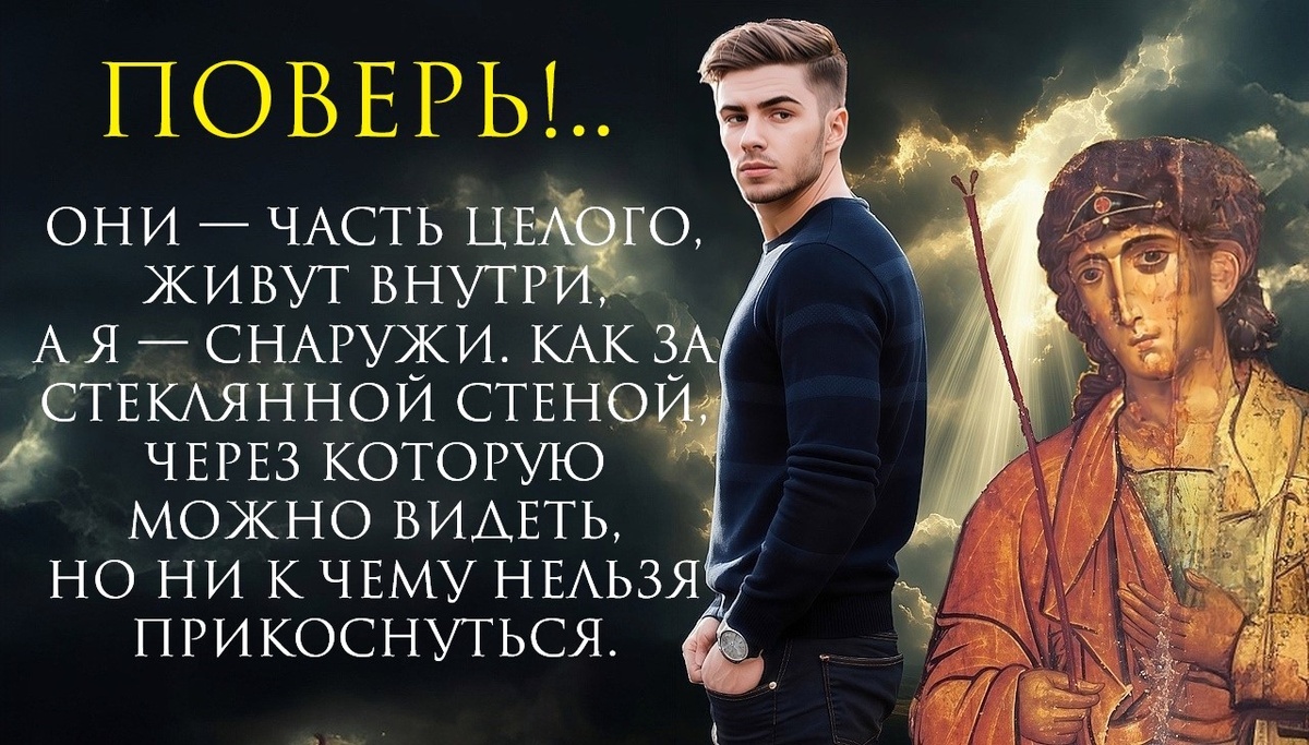 Звон церковных колоколов напоминает, что мир жив, что в нем есть глубина и смысл. Сообщение от однокурсницы — нить, связывающая героя «Поверь!..» с реальностью. Его ответ «Подхожу» — ложь, но в ней есть намек на возможность возвращения. Возможно, это первый шаг к тому, чтобы разрушить стеклянную стену, преодолеть одиночество и вновь стать частью общей жизни.