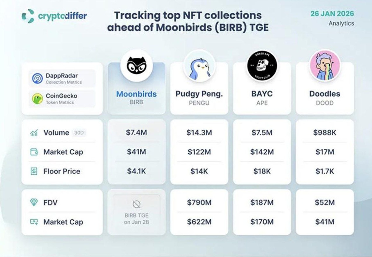 ! 28 января состоится долгожданный запуск токена Moonbirds. Аналитики CryptoDiffer подготовили срез по главным игрокам рынка, чтобы понять, в какой форме лидеры подходят к этому событию. Сводка по рынку: 🔹 Moonbirds: Набирают высоту перед листингом. Объем (30д): $7,4 млн | Капитализация NFT: $41 млн | Флор: $4100. 🔹 Pudgy Penguins: Абсолютный лидер по ликвидности. Объем (30д): $14,3 млн | Флор: $14 000 | Капитализация токена (FDV): $790 млн. Инвесторы явно доверяют «пингвинам» больше всего. 🔹 Bored Ape Yacht Club (BAYC): Тяжеловес индустрии. Капитализация NFT: $142 млн — абсолютный максимум. Несмотря на волатильность, «скучающие обезьяны» остаются самым дорогим активом в сегменте. 🔹 Doodles: Уверенная позиция в топе. Объем (30д): $988 тыс. Флор: $1700 | Капитализация токена: $41 млн. Сможет ли запуск токена Moonbirds перевернуть расстановку сил и догнать «пингвинов» по капитализации? #NFT #Moonbirds #TGE #PudgyPenguins #BAYC #Doodles #Web3