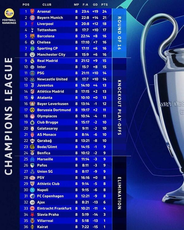 Общий этап Лиги чемпионов завершился. Итоговая таблица выглядит так: