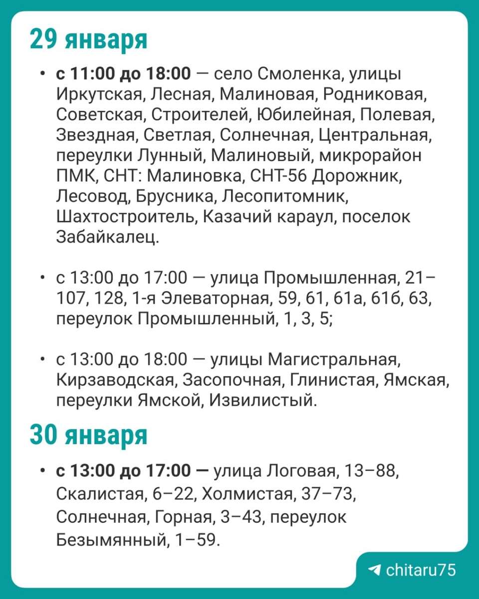 «Читаэнерго» проведет плановые отключения в эти два дня. Начинают уже сегодня. В компании добавили, что план работ могут изменить из-за погоды или при выявлении поломок на оборудовании. График и адреса.⬆️ 📞По вопросам электроснабжения можно обращаться по бесплатному круглосуточному телефону: 8-800-220-0-220 (короткий номер — 220). 🟦 «Чита.Ру» в MAX | Предложить новость