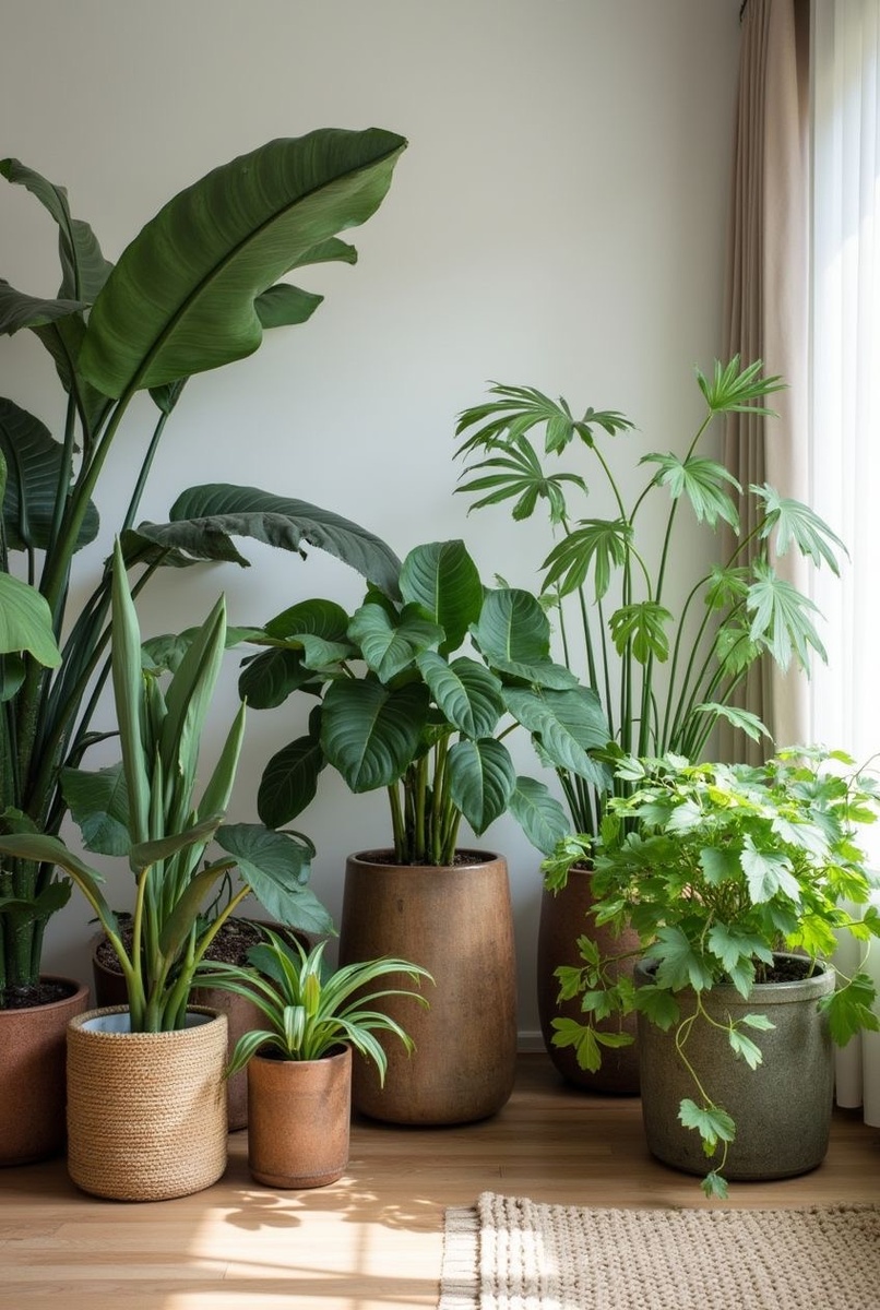Возьмите 3 растения: 1 крупное (для акцента) + 1 среднее (для полки) + 1 ампельное (для высоты). Поставьте их в треугольник в одной комнате.