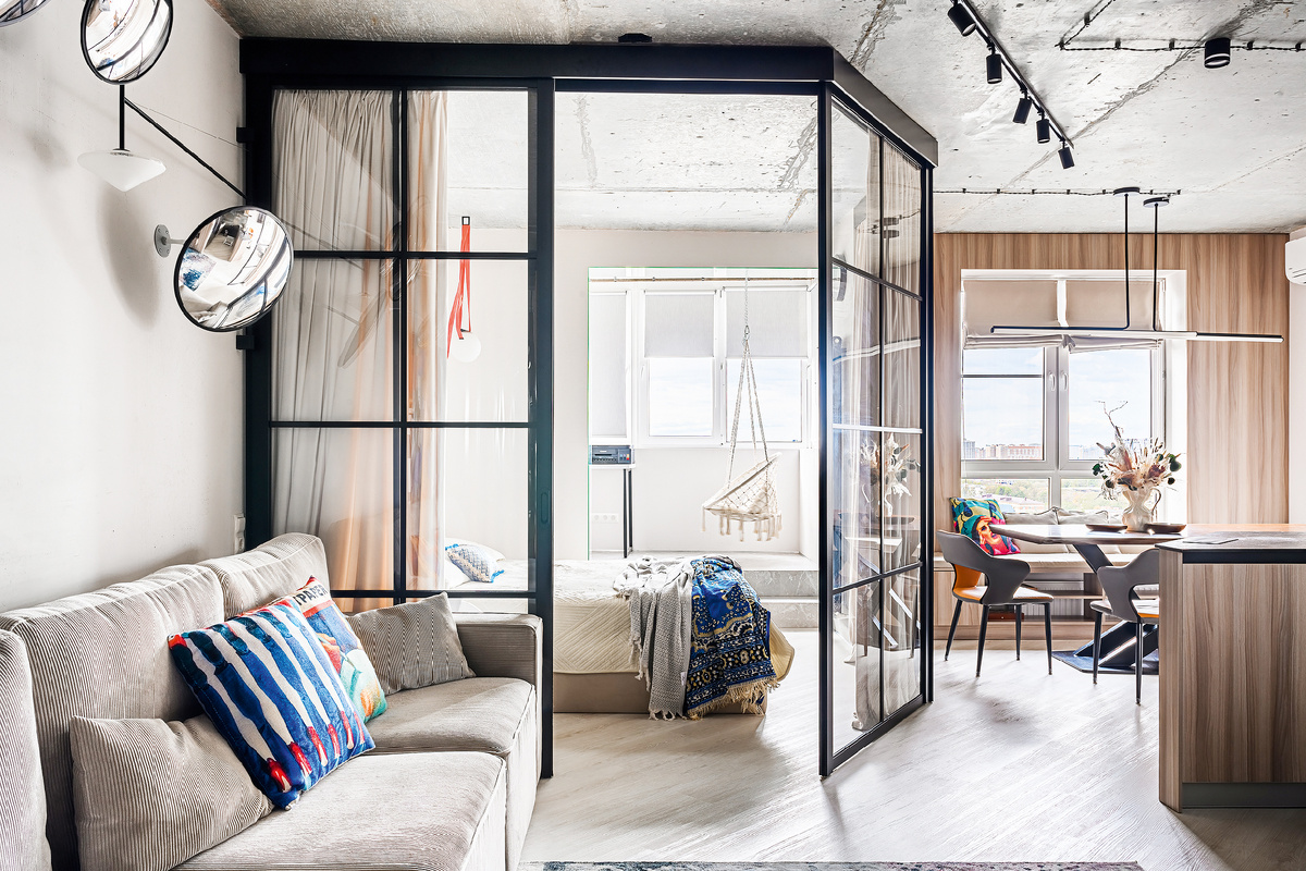 Дизайнер Алёна Щербинина смогла найти компромисс между смелым дизайном, которого ожидал заказчик, и традиционными решениями, близкими его жене. Пространство получилось функциональным и нескучным Заказчики — молодая пара, находящаяся в ожидании рождения малыша. Хозяин квартиры хотел «позитивный», веселый интерьер, а его жена, напротив, склонялась к более классическим и спокойным решениям. Мы искали баланс, точки соприкосновения, чтобы всем было комфортно жить в создаваемом дизайне. Мне было разрешено хулиганить, но только серьезно. Прежде всего, я, конечно, сломала все стены, чтобы избавиться от старой планировки. Получилось достаточное пространство, которое было зонировано на кухню-гостиную, спальню со стеклянными перегородками, место для двух вместительных гардеробов и постирочную. Спальня расположена на самом видном месте, внутри — шторы блэкаут, чтобы была возможность уединиться, а на присоединенном балконе предусмотрено место для небольшого кабинета с уютным плетеным креслом-качел
