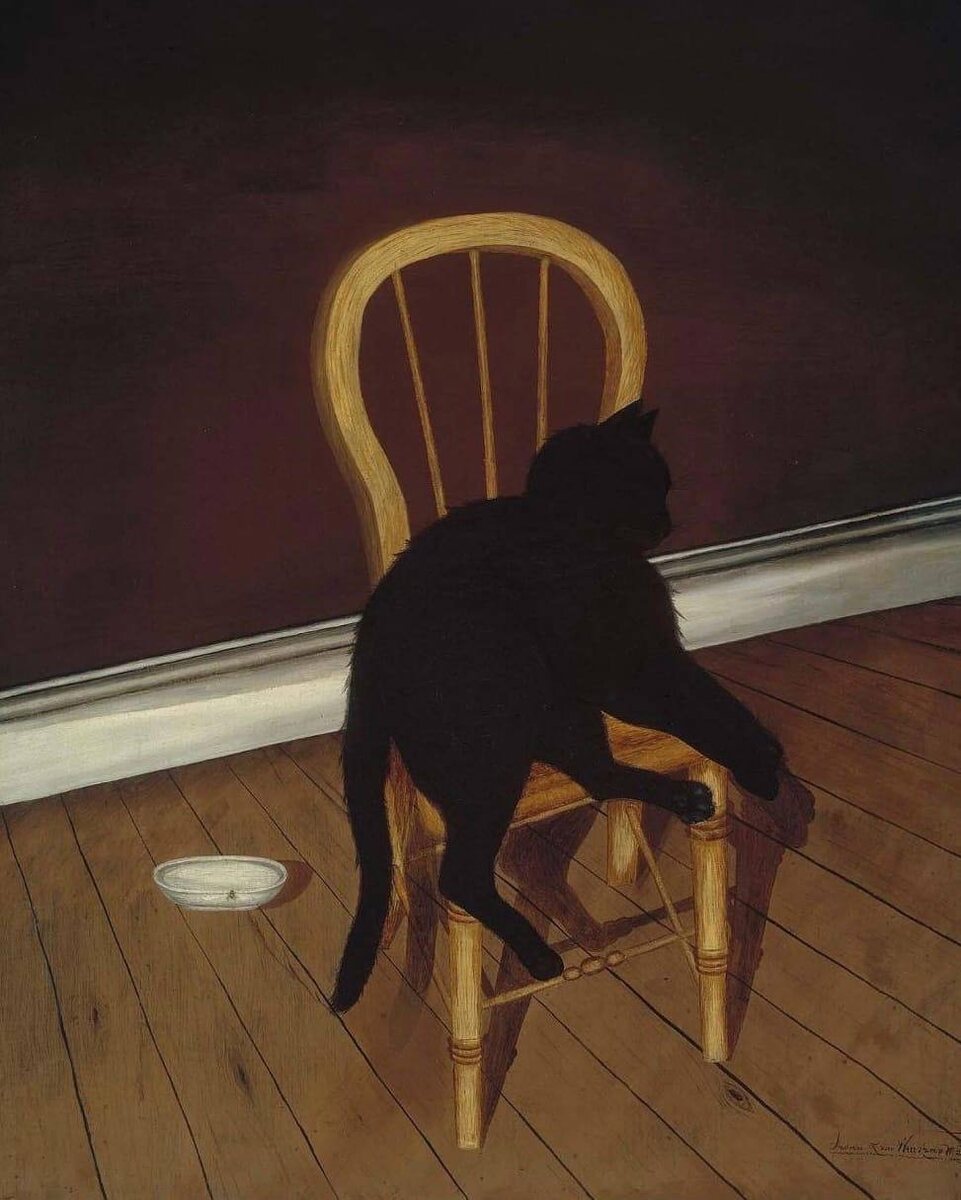 Американский врач и художник-любитель Эндрю фон Витткамп поймал тот самый момент, когда кот уже не просто сидит - а царственно полулежит, как будто позирует вечности. Ни драмы, ни героизма, ни великих сюжетов - только кот, стул и абсолютное спокойствие. Покажите своих котов в комментариях. Устроим кошачью перекличку 🐈🐾