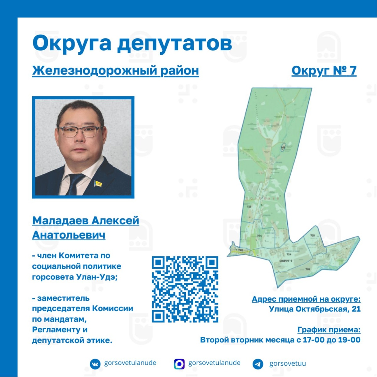 🔷Избирательный округ №7 🔹Округ №7 занимает обширные территории в северо-восточной части Железнодорожного района Улан-Удэ. Это живописный округ, в границы которого входят микрорайон Верхняя Березовка со всеми прилегающими ДНТ и СНТ, детскими оздоровительными учреждениями и санаториями, а также микрорайоны Солнечный, Зеленхоз и так далее. 🔹Депутатом округа является Алексей Анатольевич Маладаев, член Комитета по социальной политике Улан-Удэнского городского Совета депутатов, заместитель председателя Комиссии по мандатам, Регламенту и депутатской этике. 🔹Округ занят преимущественно индивидуальной жилищной застройкой и частично СНТ и ДНТ, поэтому и перечень просьб, с которыми обращаются жители, соответствующий: модернизация сетей водо- и теплоснабжения, строительство асфальтированных дорог и обновление образовательных учреждений. 📍Адрес приемной на округе: ул. Октябрьская, 21 🗓График приема: Второй вторник месяца с 17-00 до 19-00 🔎Подробнее о том, какие микрорайоны, улицы, пере