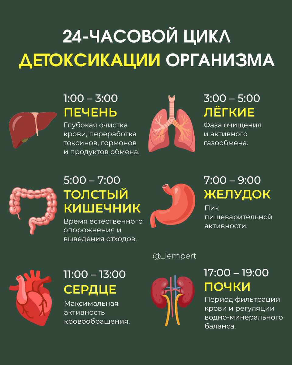 Период наиболее активной работы печени. В это время происходит глубокая очистка крови, переработка токсинов, гормонов