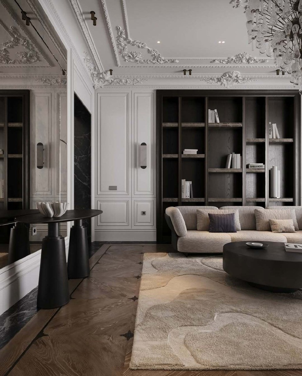 Эта утончённая гостиная — оазис спокойствия и изысканности, где каждая мелочь работает на создание неповторимой атмосферы