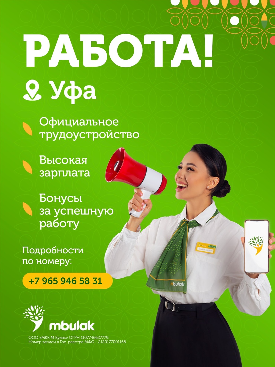 ! Не упустите шанс стать частью Компании М Булак! 📍Прямо сейчас мы ищем специалистов по выдаче займов в городе Уфа! ✅ Стабильный доход: фиксированная зарплата + высокие бонусы ✅ Доплаты на проезд и моб. связь ✅ Обучим с нуля, опыт не требуется! ✅ Гибкий график ✅ Официальное трудоустройство ✅ Поощрение лучших: слёты за границей! Все подробности Вы можете узнать по номерам: 📞 +79659465831 🚀 Не забудьте поделиться с друзьями, которые ищут работу в России! 💬 М Булак в MAX и ВК