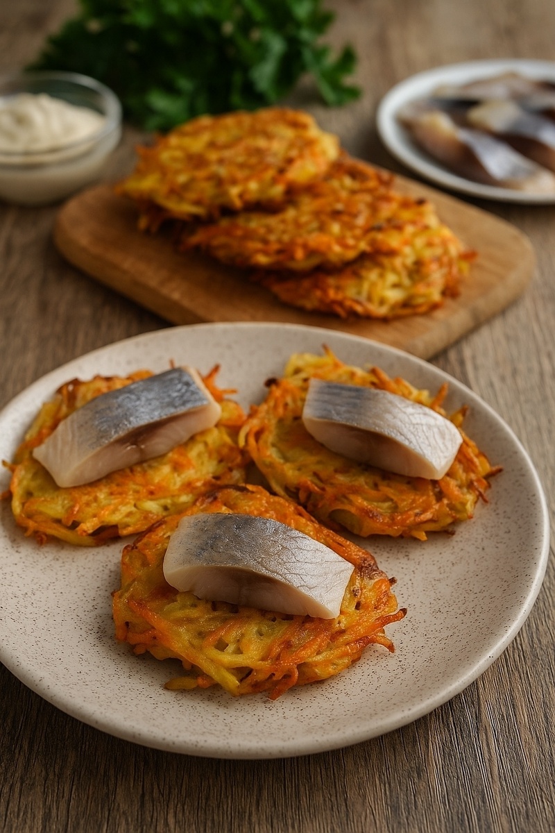 ✨ В итоге получаются мягкие, слегка хрустящие овощные лепёшки, прекрасно сочетающиеся с солёной рыбой. Просто, вкусно и оригинально!