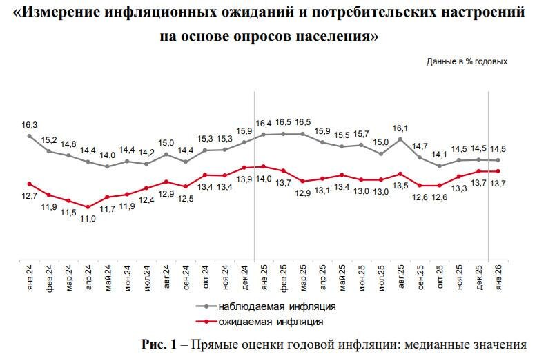 ? Опросы бизнеса и населения за январь 2026 года фиксируют тревожную дивергенцию: на фоне роста инфляционных ожиданий наблюдаются признаки ослабления потребительского и производственного спроса. 🤔 О чем говорит нам бизнес? Инфляционные ожидания предприятий достигли максимума с 2022 года: средний ожидаемый рост цен на три месяца вперёд в годовом выражении ускорился до 10,4% (с 8,5% в декабре). В долгосрочные планы на 2026 год компании закладывают инфляцию на уровне 9,3%. Параллельно индикатор бизнес-климата снизился до 1,7 пункта из-за обвала ожиданий до минимума с октября 2022 года (7,4 пункта). Наиболее пессимистичные прогнозы по спросу — в розничной торговле и сельском хозяйстве. Бизнес связывает рост ценовых ожиданий в первую очередь с эффектом повышения налоговой нагрузки, основная часть которого, предположительно, уже отыграна в январе. Дальнейшая ценовая динамика будет определяться спросом, демонстрирующим признаки слабости. 🤔 О чем говорит население? Ожидания домохозяйс