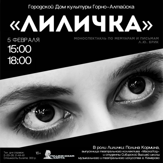 ! 🔥 Студенты Сибирской Высшей школы музыкального и театрального искусства города Кемерово представляют камерный молодежный моноспектакль-концерт «Лиличка», который откроет вам уникальный взгляд на жизнь и судьбу Лили Брик — одной из самых противоречивых и обаятельных фигур эпохи cеребряного века. Это не просто спектакль — это 55 минут откровенного диалога о философии любви, свободе и бунте! 🖤 Основанный на мемуарах Лили Брик, письмах и документальных фрагментах, он вобрал в себя дух футуризма, его энергию, динамику, нашедшую словесное воплощение в стихах Маяковского и музыкальное в авторских композициях группы «ЗАИ». Где? - Городской Дом культуры Горно-Алтайска Когда? - 5 февраля 2026 года в 15:00 и в 18:00