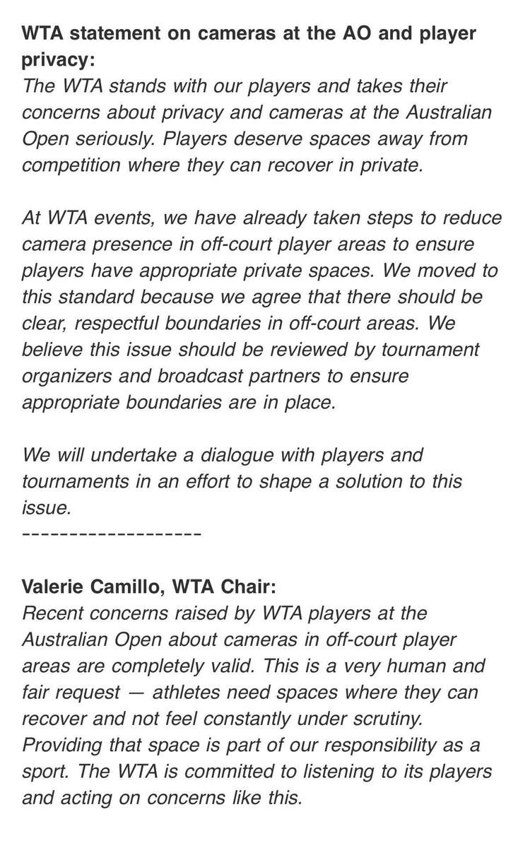 : WTA поддерживает своих игроков и серьезно относится к их опасениям по поводу конфиденциальности и камер на Открытом чемпионате Австралии. Игроки заслуживают мест вдали от соревнований, где они могут восстановиться в уединении. На мероприятиях WTA мы уже предприняли шаги по уменьшению присутствия камер в неигровых зонах для игроков, чтобы обеспечить им надлежащее личное пространство. Мы перешли к этому стандарту, потому что согласны с тем, что в неигровых зонах должны быть четкие границы. Мы считаем, что этот вопрос должен быть рассмотрен организаторами турнира и партнерами по вещанию, чтобы обеспечить соблюдение соответствующих границ. WTA обязуется прислушиваться к своим игрокам и реагировать на подобные проблемы. Подпишись на Эйс и точка