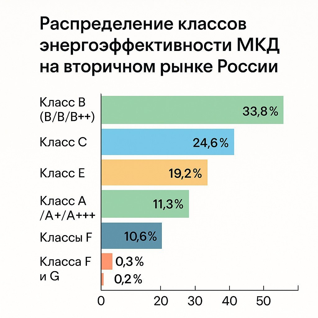 жилья и снижением расходов жителей. Домклик изучил вторичный рынок жилья по энергоэффективности многоквартирных домов. Вот что получилось: Класс B лидирует — 33,8% квартир на вторичке относятся к B/B+/B++. Основная масса рынка — классы: • C — 24,6% • D — 19,2% • E — 11,3% Высокие классы A/A+/A++ — всего 10,6%. Классы F и G — менее 1% (0,3% и 0,2%). • B — 28,1%