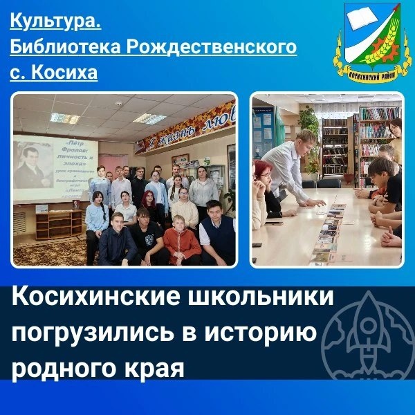 👍В рамках познавательной экскурсии учащиеся 9Б класса Косихинской школы недавно посетили районную библиотеку Р.Рождественского в с. Косиха, где приняли участие в увлекательном мероприятии, посвящённом выдающейся исторической фигуре — Петру Фролову. ➡️Мероприятие прошло в форме интерактивной игры, приуроченной к знаменательной дате — 300-летию горноперерабатывающей промышленности на Алтае. ✔️Центральным персонажем мероприятия стал Пётр Фролов — человек, чья жизнь тесно связана с развитием промышленного потенциала региона. Участники познакомились с деятельностью Петра Козьмича Фролова, занимавшего пост главного командира Колывано-Вознесенских заводов и Томского губернатора. Вторая часть игры познакомила школьников с разнообразием талантов и заслуг Петра Фролова. https://t.me/adm_kosih_raion/14559