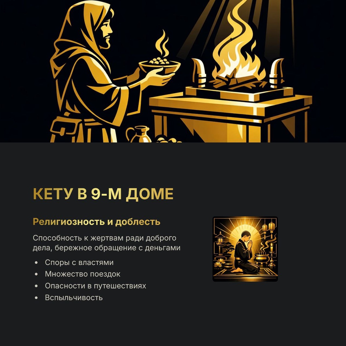 🌊 Это сложное и глубокое положение, где отрекающийся лунный узел попадает в дом веры, высшего знания и дальних странствий. Оно указывает на кармическую миссию, связанную с поиском истины через преодоление иллюзий и внешних препятствий. 🔸 Сильные стороны и духовный путь: 🔸 Глубинная религиозность: Вы — человек с внутренней, часто неортодоксальной духовностью, готовый к жертвам и лишениям ради высших идеалов или защиты истины. Это путь воина духа. 🔸 Независимость мышления: Ваше стремление к познанию свободно от догм, что может приводить к спорам с официальными властями, учителями или устоявшимися системами верований. ⚖️ ✨ Кармические вызовы и испытания: 🔸 Опасные путешествия: Ваша жизнь связана с частыми поездками, во время которых возможны опасности, особенно связанные с водой (плавания) или воздухом (полеты). Путешествия часто имеют фаталистичный, кармический оттенок. 🔸 Финансовые уроки: В материальной сфере возможны неудачи в спекулятивных предприятиях. Деньги приходят с