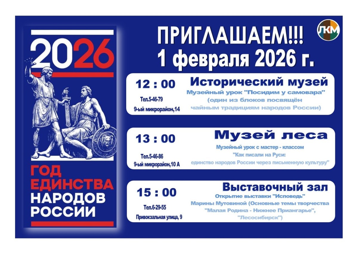 ! 1 февраля Лесосибирский краеведческий музей распахнёт свои двери для всех, кто ценит историю, культуру и духовное наследие нашей многонациональной страны. Вас ждут увлекательные музейные уроки и яркие мероприятия: - «Посидим у самовара» — погружение в традиции русского чаепития, знакомство с обычаями и атмосферой душевных посиделок за самоваром. - «Как писали на Руси» — путешествие в прошлое: вы узнаете о древних способах письма, попробуете себя в каллиграфии и откроете тайны берестяных грамот. - Открытие выставки художника Марины Мутовиной "Исповедь" - «Малая Родина — Нижнее Приангарье» — возможность увидеть живописные полотна, воспевающие красоту нашего края, его природу и самобытность. Когда: 1 февраля. Где: Лесосибирский краеведческий музей. Для кого: для всех желающих — от мала до велика! Приходите сами, приводите друзей и семью. Вместе мы сохраним и приумножим богатство нашей общей истории. Ждём вас в Лесосибирском краеведческом музее! Пусть Год Единства народов России на