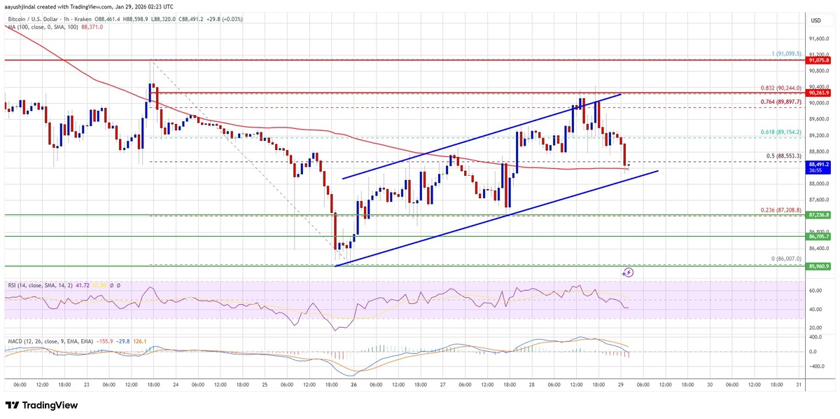 ? Биткойн предпринял попытку восстановления выше $89 500, но не удержался выше $90 000. Сейчас цена снижается, и дальнейшее падение возможно, если BTC пробьет поддержку на уровне $88 000. Отсутствие закрепления выше $90 000 указывает на медвежье давление, несмотря на торговлю выше $88 200 и 100-часовой скользящей средней. 📊 Ключевые моменты: - MACD набирает обороты в медвежьей зоне. - RSI для BTC/USD опустился ниже 50. - Поддержка: $88 200, $88 100 (восходящий канал), $88 000, $87 500, $87 200, $87 000, $86 000. - Сопротивление: $89 150, $89 800, $90 250, $91 200, $92 000, $92 500. ⚠️ Риски: Пробой ниже $88 000 может привести к дальнейшему снижению.