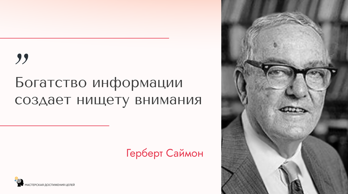 Автор термина «Ограниченная рациональность», Герберт Саймон занимался исследованием процессов принятия решений. В 1978 году - лауреат Нобелевской премии. Но еще в 1971 году он обратил внимание на то, что чем больше мы берем на себя, тем хуже получаем результаты в каждом деле. Потому что в отличие от денег, например, ресурс внимания ограничен. Нет, мы не можем впихнуть в себя больше, чем впихивается. А ведь в 71-ом что так сильно мешало фокусироваться на важном? Ну максимум газеты и телевизоры? Тогда не было таких возможностей, как сегодня (дорогой интернет, спасибо), быть и психологом, и тарологом, и фотографом, и бухгалтером в одном лице. Но уже тогда стремление человека угнаться сразу за несколькими зайками, вызывало проблемы. Сегодня это просто бич: