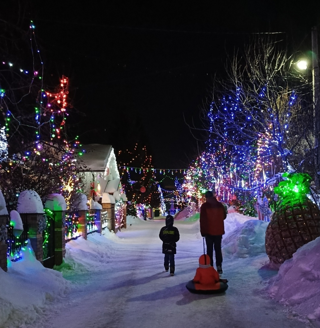 Жители этой улицы сами украшают свои дома и прилегающую территорию не скупясь на огоньки, фигурки, гирлянды, выстаивают смешные композиции. Идешь и настроение повышается, сразу хочется домой к мандаринам и Иронии судьбы, нарядить ёлку. И