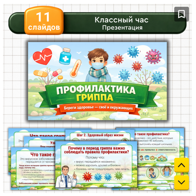 В презентации информация подана простым, понятным языком, без перегрузки медицинскими терминами: что такое грипп, как он передаётся, какие бывают признаки и что реально помогает не заболеть. Описаны три понятных шага профилактики: личная гигиена, здоровый образ жизни, правильное поведение при контакте с больным. Цель: сформировать у обучающихся навыки профилактики гриппа и ответственное отношение к своему здоровью и здоровью окружающих. Внутри: 11 логично выстроенных слайда.