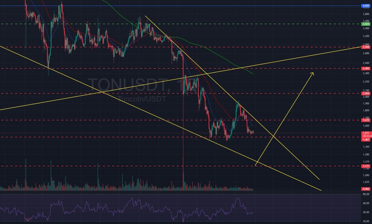 💬 Держится малый, скоро уже, скоро.. Pro TON: 🕯 С прошлого обзора с начала года, график особо не изменился, уверено стоим выше 1.47-1.5, перепроданные в Клине, был хороший заход на пробой, но не смогли и пойдя через поджатие стекли обратно на уровень. На текущий момент идет формирование двойного дна, на дневном графике, которое мы закончим если не подольют масла в огонь, что позволит нам прожать Клин и уже выйти, после чего мы увидим более солидный рост по нему как минимум быстрые 2.5. По Рискам: 🔽 В кризисные моменты 1.17 могут добить без изменений пока, но думаю и текущий уровень устоит, причин идти ниже по активу не видно сейчас. 🔖 Поддержи нас Комментом и 🚀 на TradingView! 😎 Навигация 💬 Чат 🎥 YouTube ↔️ BitGet