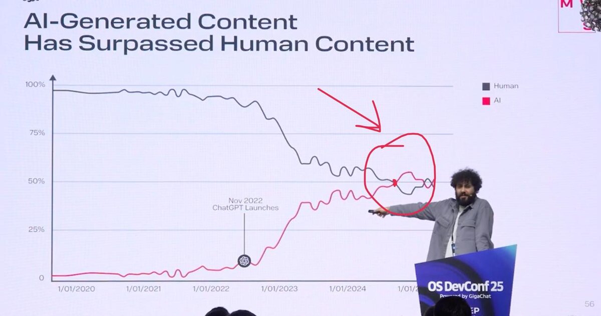 В конце 2025 года количество созданного контента в мире с помощью ИИ перевалило за 50%. С учетом текущей скорости технологий — звучит логично Но это создает одну проблему, которую я пока не знаю как решают. Но есть повод об этом подумать Нейронки обучались на контенте, которые сделали люди. Поэтому контент и стал практически неотличим от настоящего. Но если количество созданного контента с ИИ приблизится к 100%, то на чем будут обучаться нейронки? На видео, которые сделали другие нейронки? Звучит как замкнутый круг, который приведет к деградации такого подхода. Хз что нужно делать. Контролировать процент созданного контента с ИИ? Мне кажется, что такие ограничения технологий никогда не работали Либо рост качества генераций остановится, потому что он уже на достаточном уровне? Ну стратегичестке звучит тоже так себе Короче вопрос в моей голове открытый. А вы что думаете?