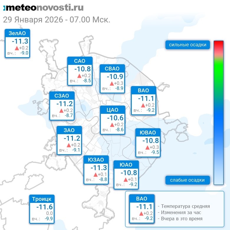 В 7:00 в Москве было от -12.1°C до -10°C, средняя температура -10.9°C #погода #Москва #зима #температура #29января #четверг