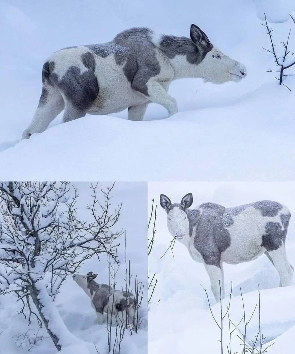 Норвежскому фотографу дикой природы в декабре 2023 года удалось снять очень редкого пегого лося. Животное поражает воображение своим уникальным внешним видом. Пегий лось, который обитает в провинции Бускеруд, Норвегия, очень пугливый. Однако Томасу Мерху удалось запечатлеть пятнистое животное за трапезой.